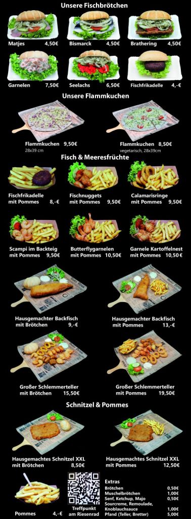 Bei uns genießt ihr nicht nur Fischbrötchen, sondern auch Flammkuchen, Schnitzel, Currywurst und Pommes.